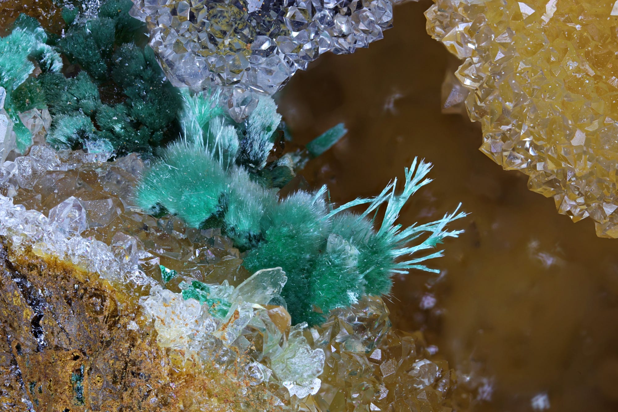 Below: Malachite, Barite, Quartz, Spring Creek, Wilmington, South Australia.. Width of view 6mm.