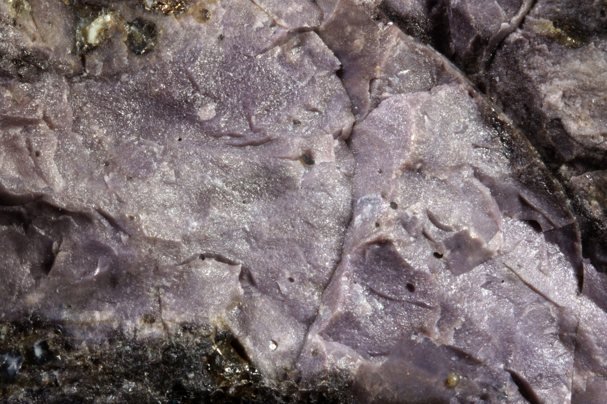 Below: Purple K-Na bearing aluminous glass with minor, sub-microscopic mullite, pyrrhotite, spinel, quartz, and corundum, Raeburn Quarry, Breadalbane, Tasmania. Width of view 5mm.
